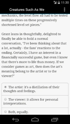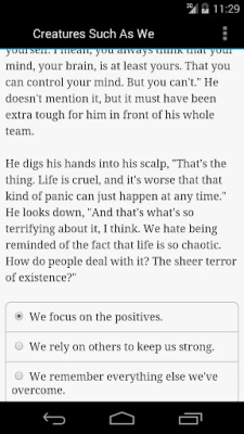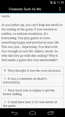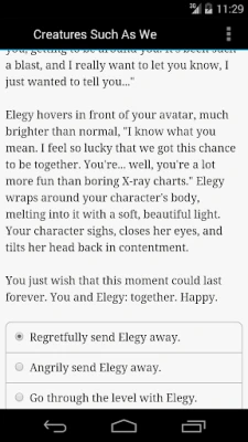 "Creatures Such As We" is a philosophical interactive romance novel by Lynnea Glasser, where your choices control the story. It's entirely text-based--without graphics or sound effects--and fueled by the vast, unstoppable power of your imagination.