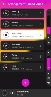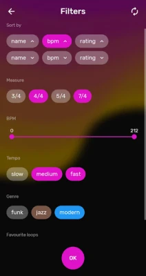 You can sort beats by: BPM, type (funk, jazz, modern), tempo and other. If you want - choose your favourite tracks and make your own list.