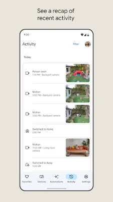 The Google Home app is designed to show you the status of your home and keep you up to date with what you may have missed. Check in on your home anytime and see a recap of recent events.