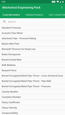 Fluid Mechanics Calculator contains 97 calculators, that can quickly and easily calculate different fluid mechanics, mechanical, civil, structural, pipe flow and engineering parameters. Automatic and accurate calculations and conversions with every unit and value changes.